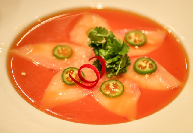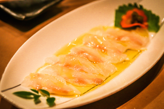 You might think that two carpaccio dishes in a row would be overkill, but you’d be wrong: Chef Ito’s Madai Carpaccio was a surprising revelation, introducing us to the mild Japanese red snapper accentuated with EVOO, sea salt, a hint of yuzukosho (a chile pepper paste) and served atop a bed of thinly sliced lemon. Clean and zesty, it proved a timely palate cleanser for the fabulous flavors soon to come.